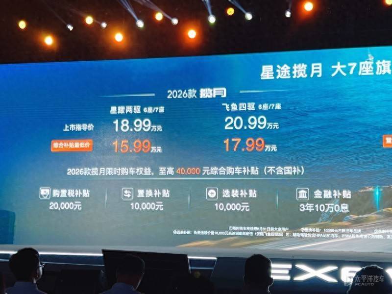 2026款星途揽月 官方指导价 车型售价(万元)星耀两驱-6座/7座18.99飞鱼四驱-6座/7座20.99 注:数据来源 制表: 太平洋汽车网